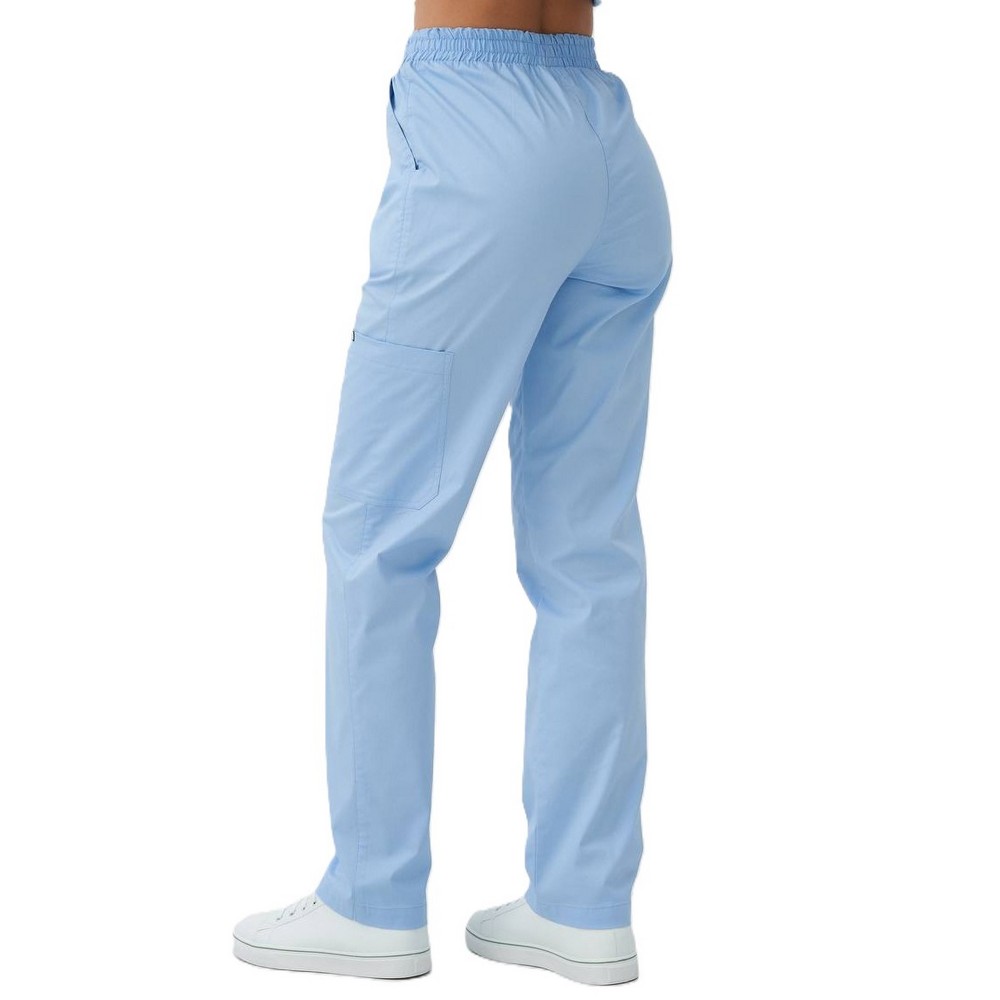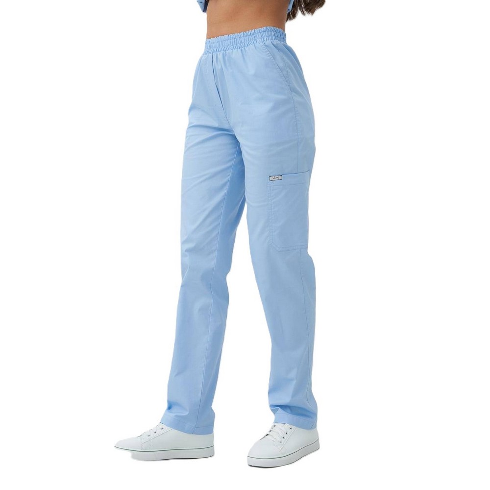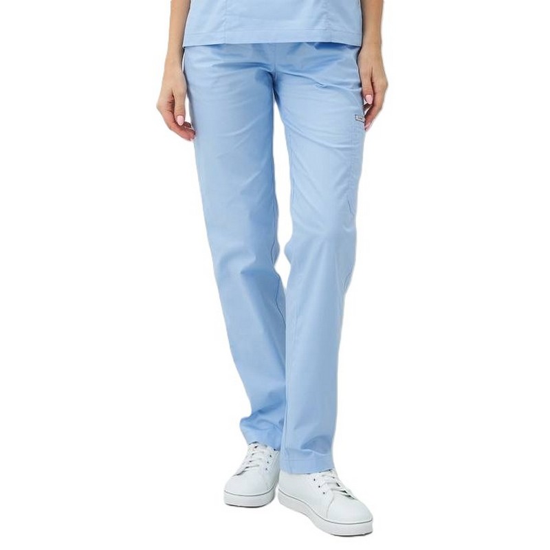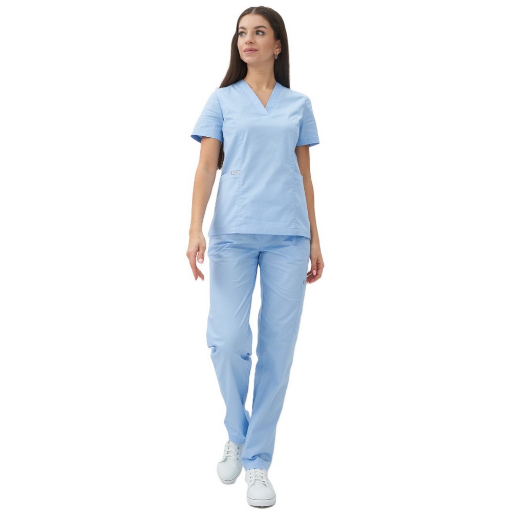 Костюм медицинский голубой состоит из блузы, брюк. Блуза прямого покроя с V-образным вырезом горловины. Рукава короткие. Брюки прямого покроя на резинке.