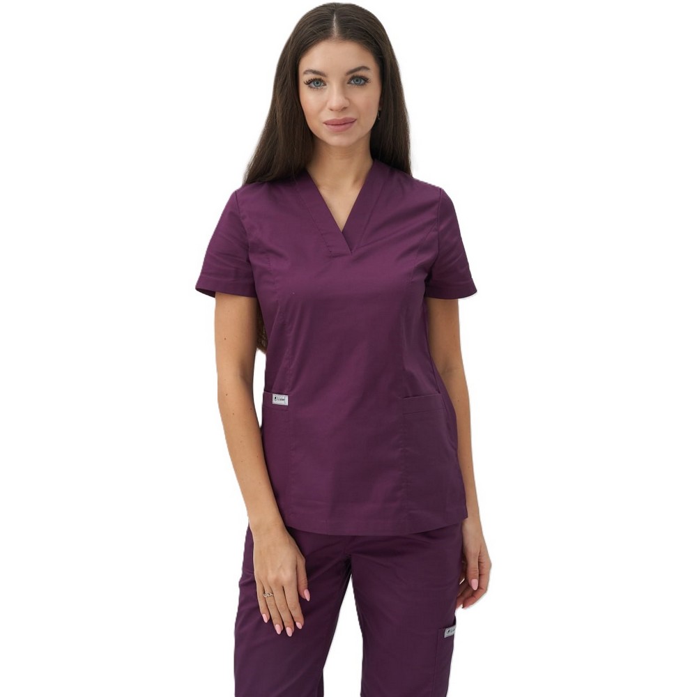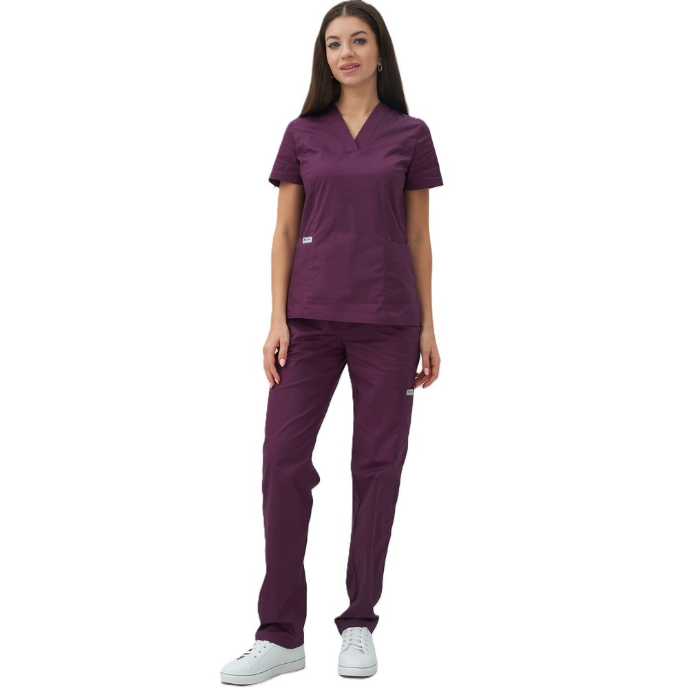 Костюм медицинский сливовый состоит из блузы, брюк. Блуза прямого покроя с V-образным вырезом горловины. Рукава короткие. Брюки прямого покроя на резинке.
