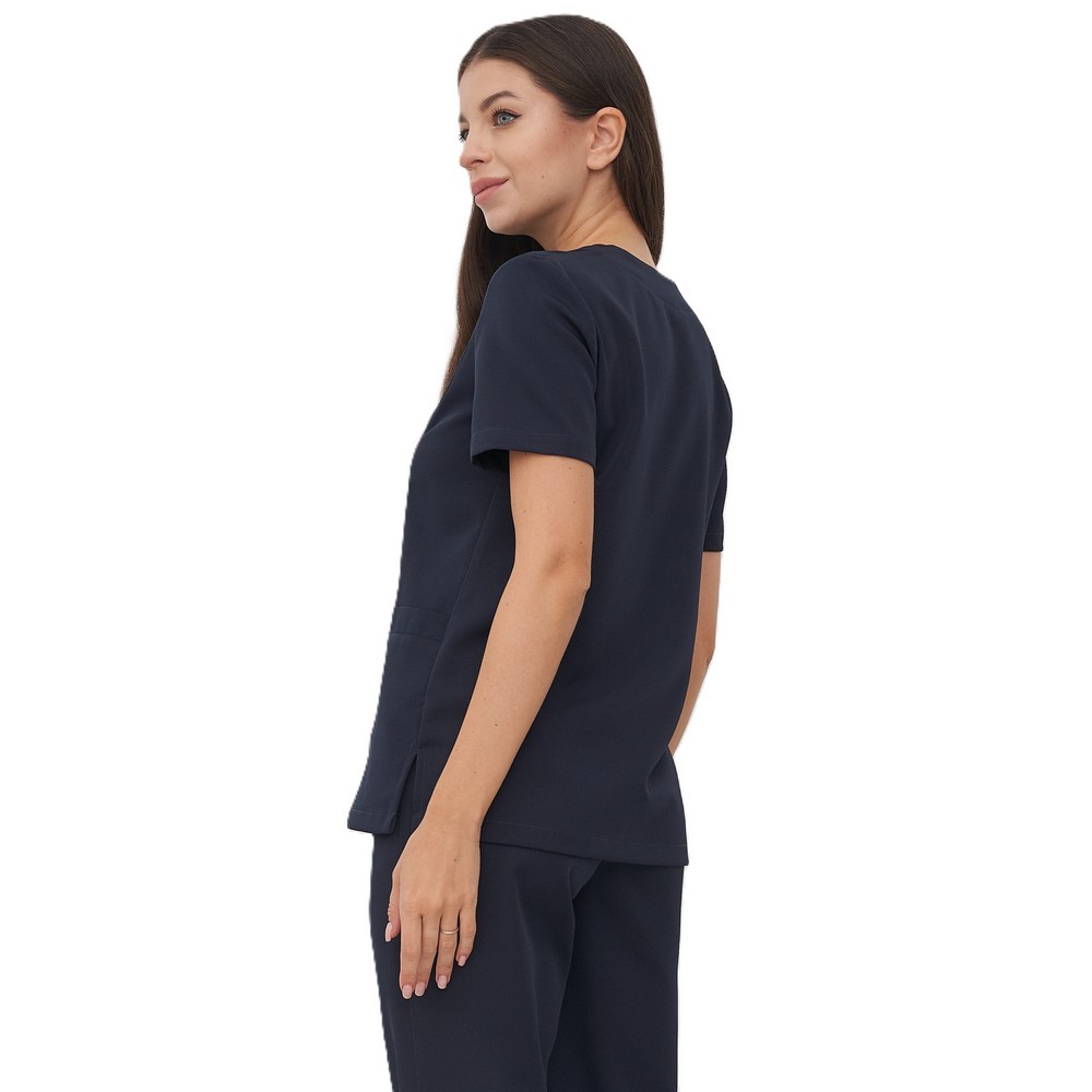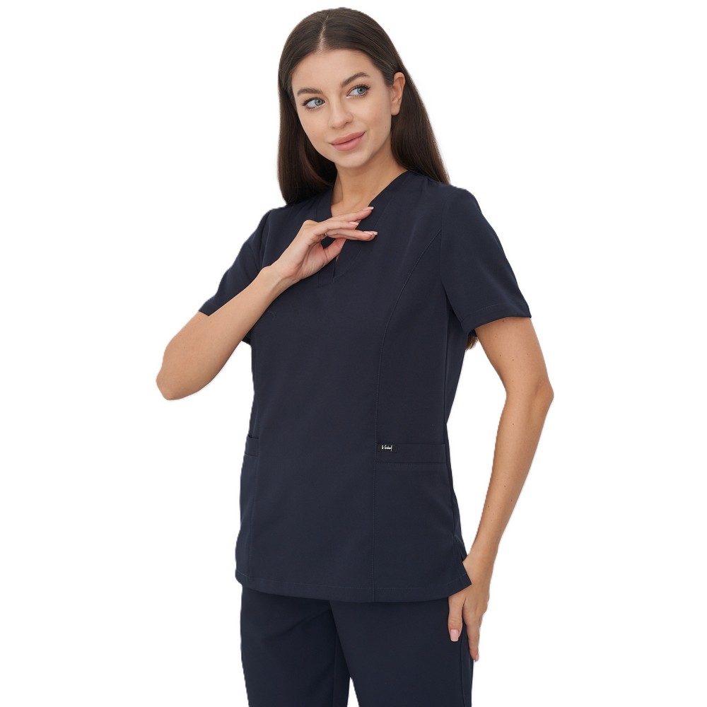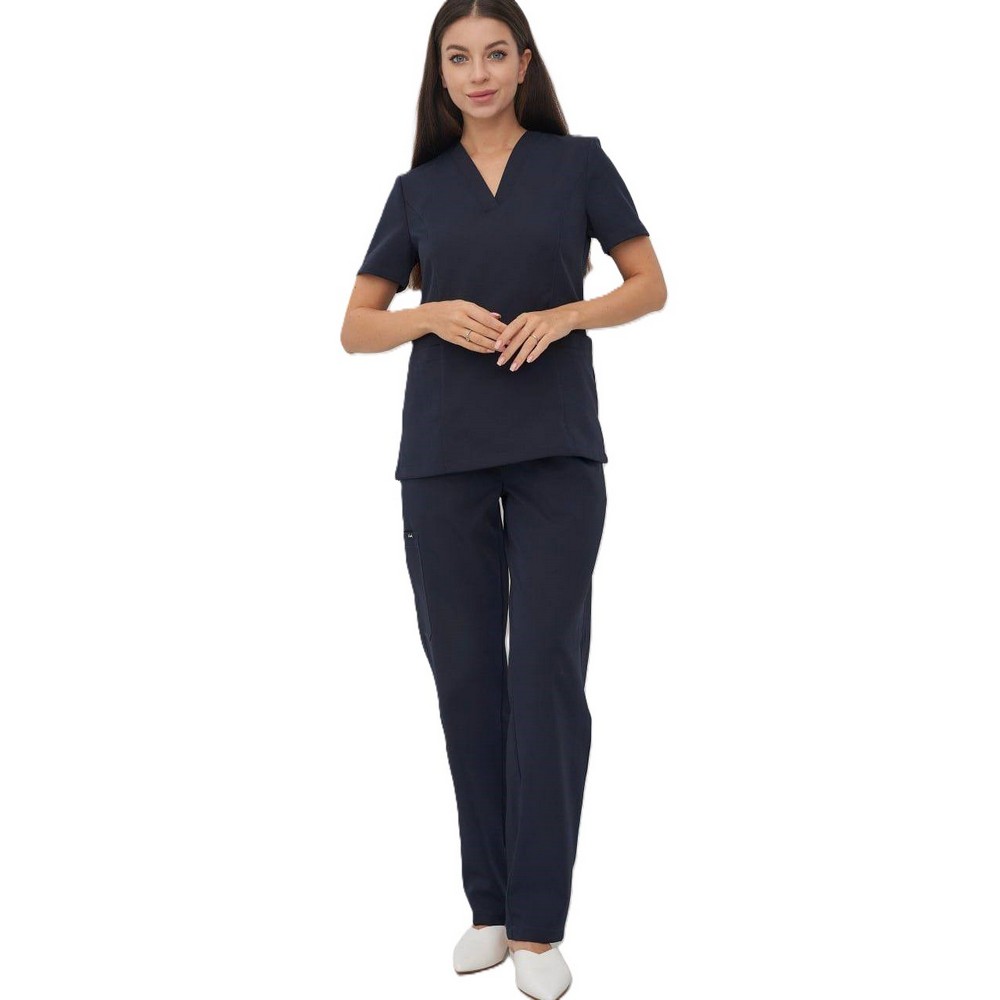Костюм медицинский темно-синий состоит из блузы, брюк. Блуза прямого покроя с V-образным вырезом горловины. Рукава короткие. Брюки прямого покроя на резинке.