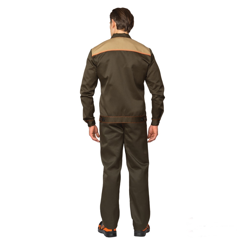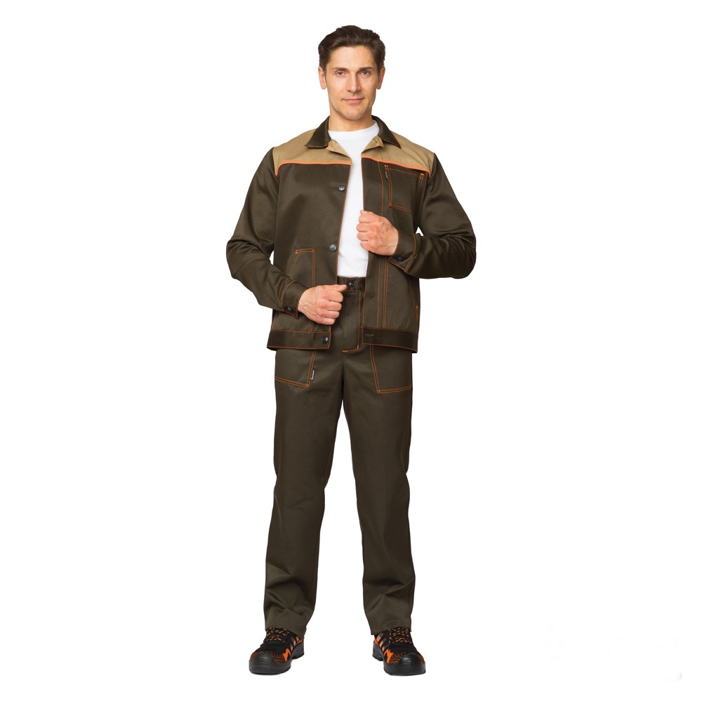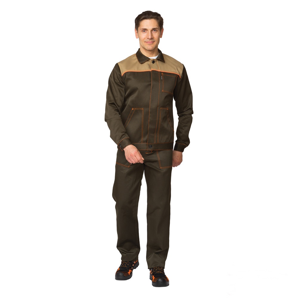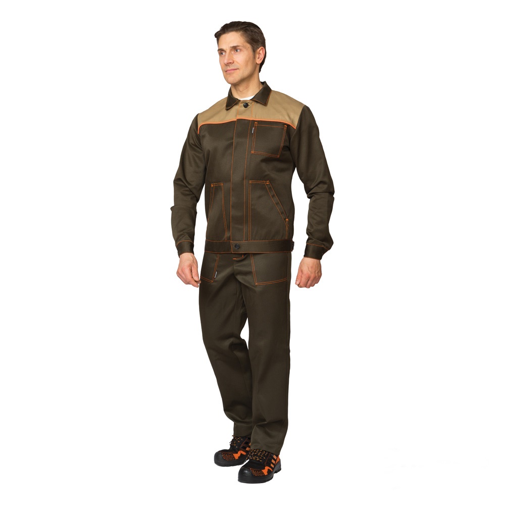 Костюм мужской «Молл» имеет практичный дизайн включает сочетание цветов хаки и бежевого, а контрастная оранжевая строчка добавляет стильный акцент.