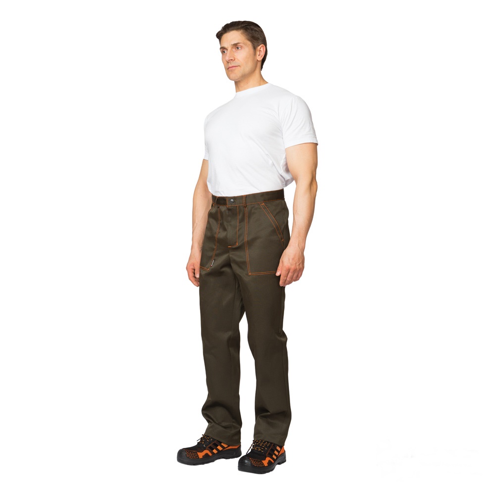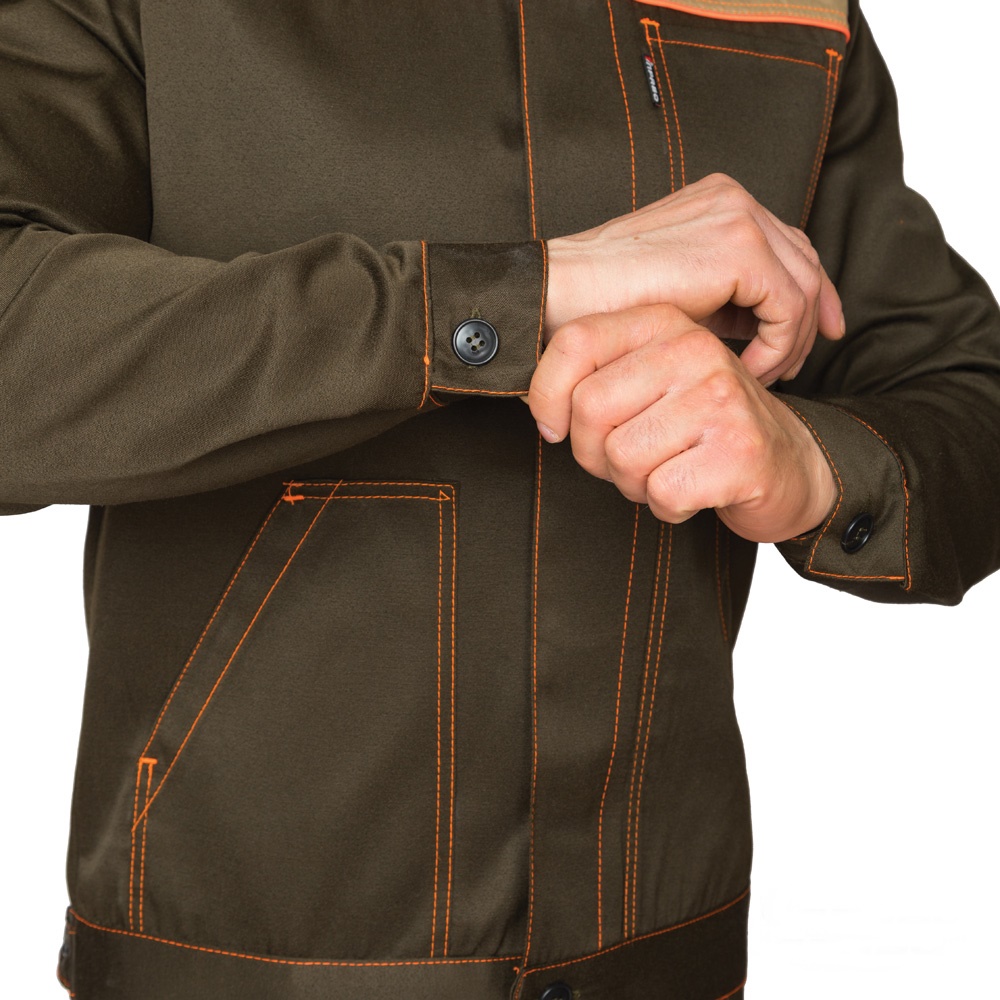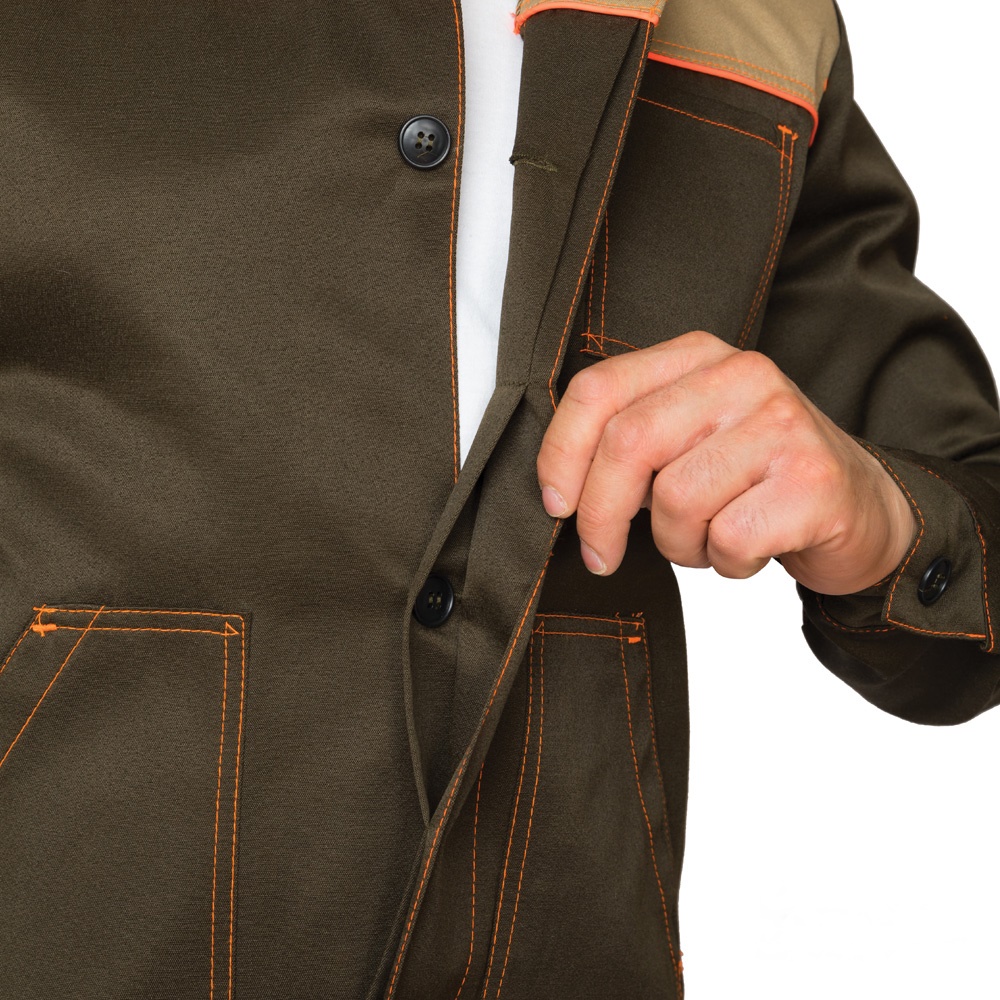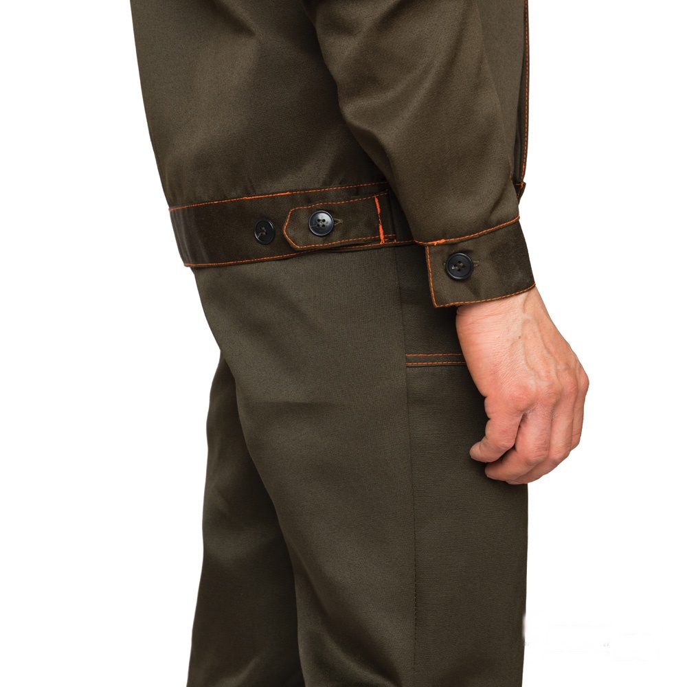 Костюм мужской «Молл» имеет практичный дизайн включает сочетание цветов хаки и бежевого, а контрастная оранжевая строчка добавляет стильный акцент.