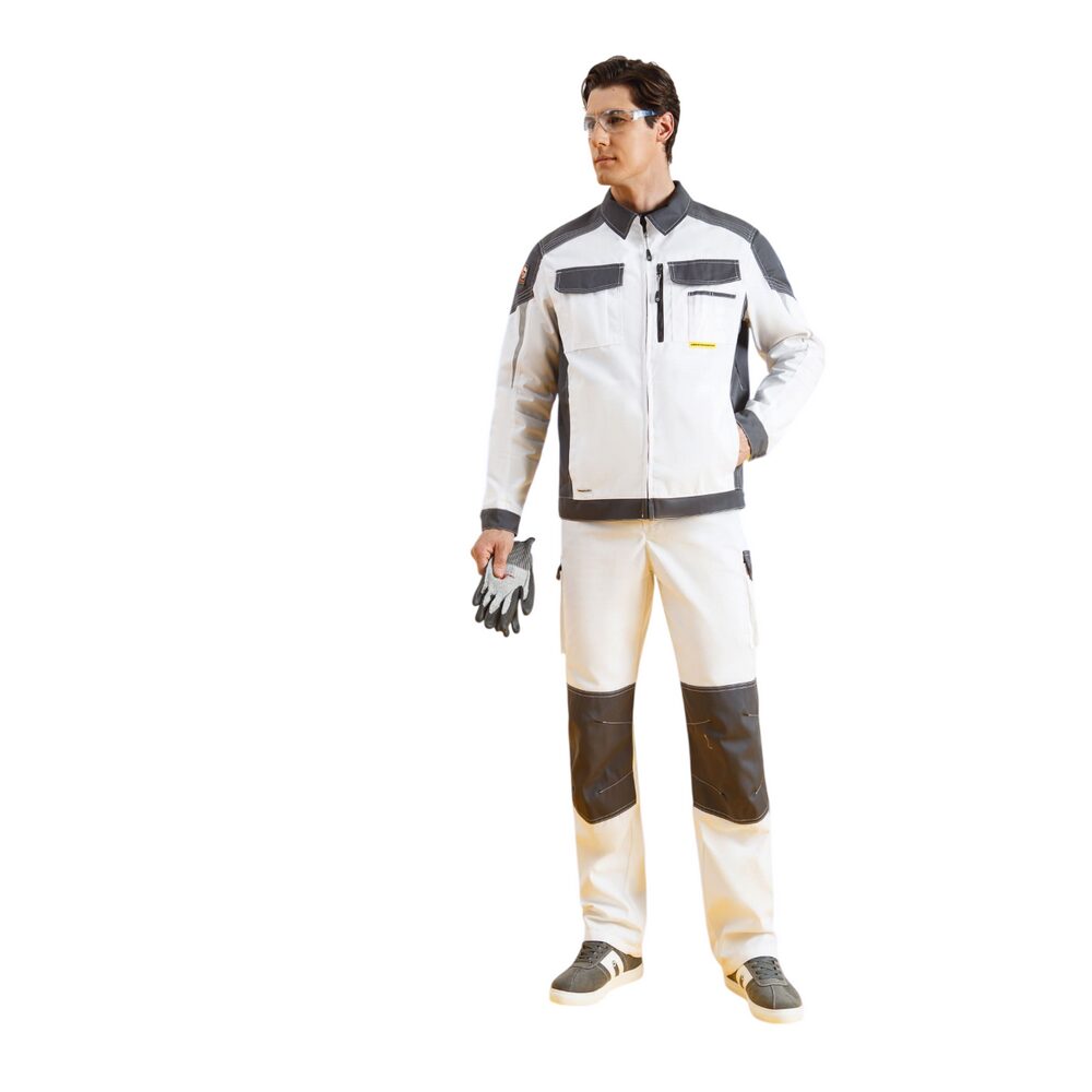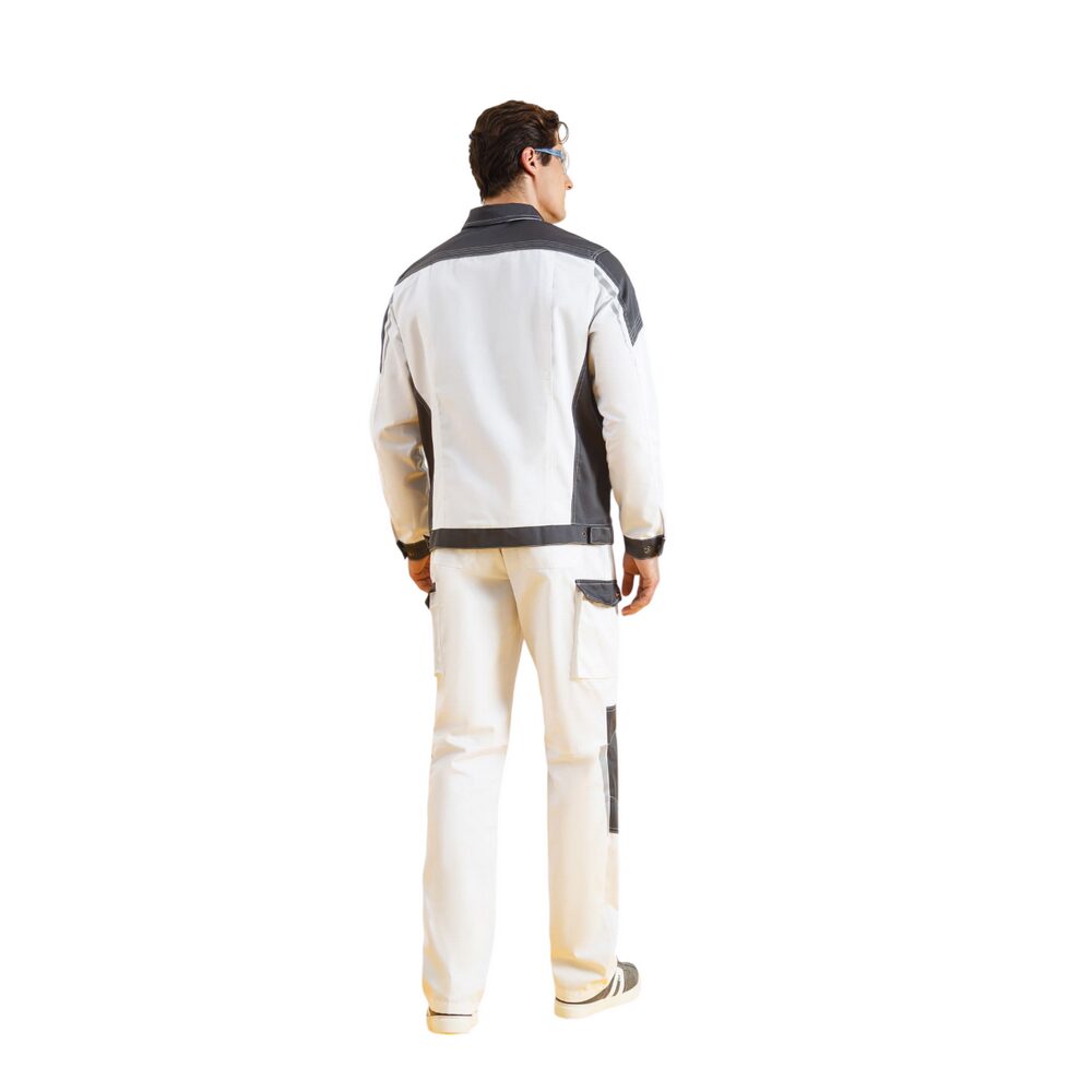 Костюм «Статус» (белый/графит) изготавливается из прочного смесового материала с содержанием хлопка. Ткань обладает водоотталкивающими свойствами, хорошо отстирывается от пятен при обычном режиме стирки в стиральной машине.