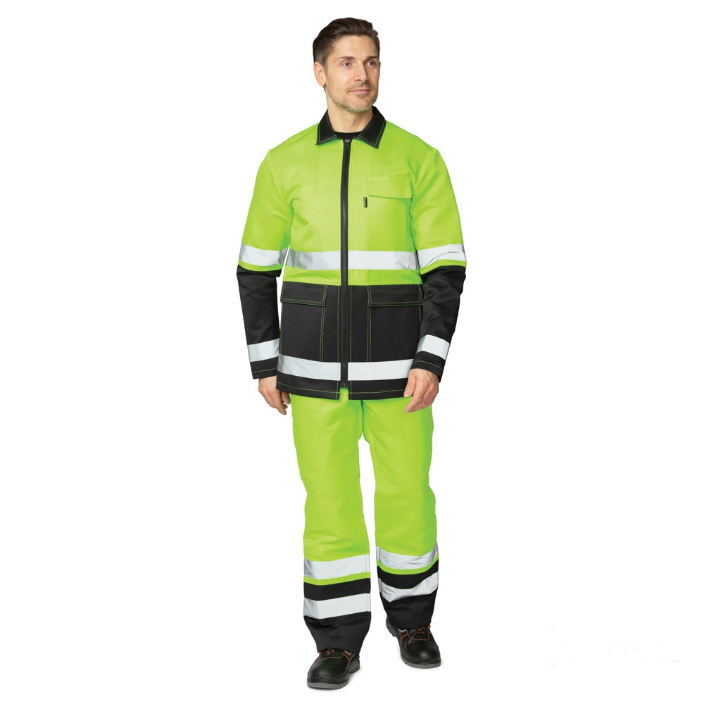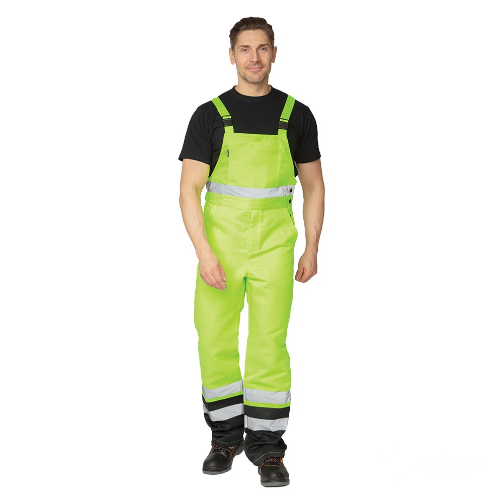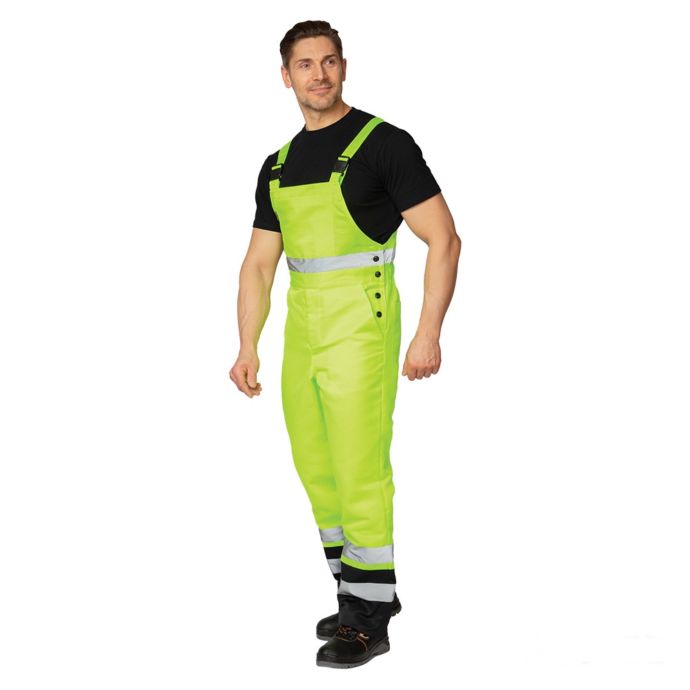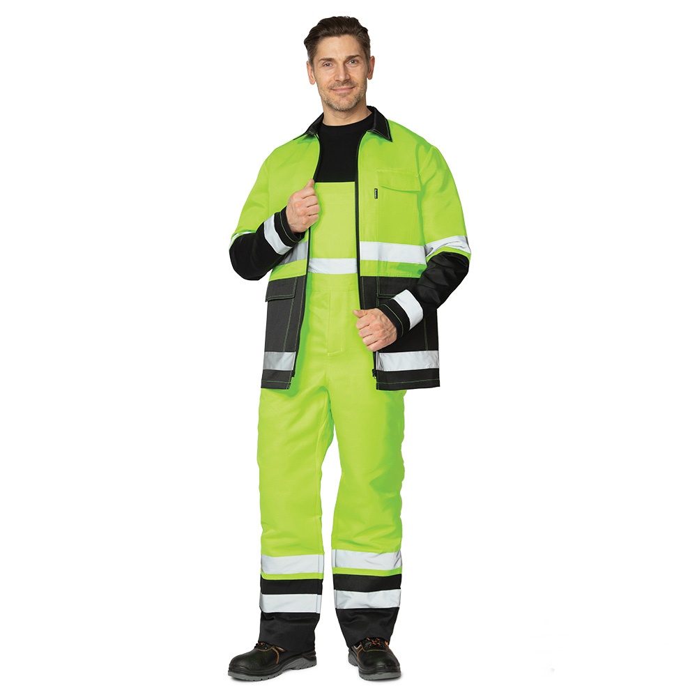 Обратите внимание на куртку и полукомбинезон с двойными светоотражающими полосами (СОП). На куртке и полукомбинезоне — два ряда полос шириной 50 мм, а на груди полукомбинезона — одна полоса. Эти элементы обеспечивают видимость работника даже без куртки.