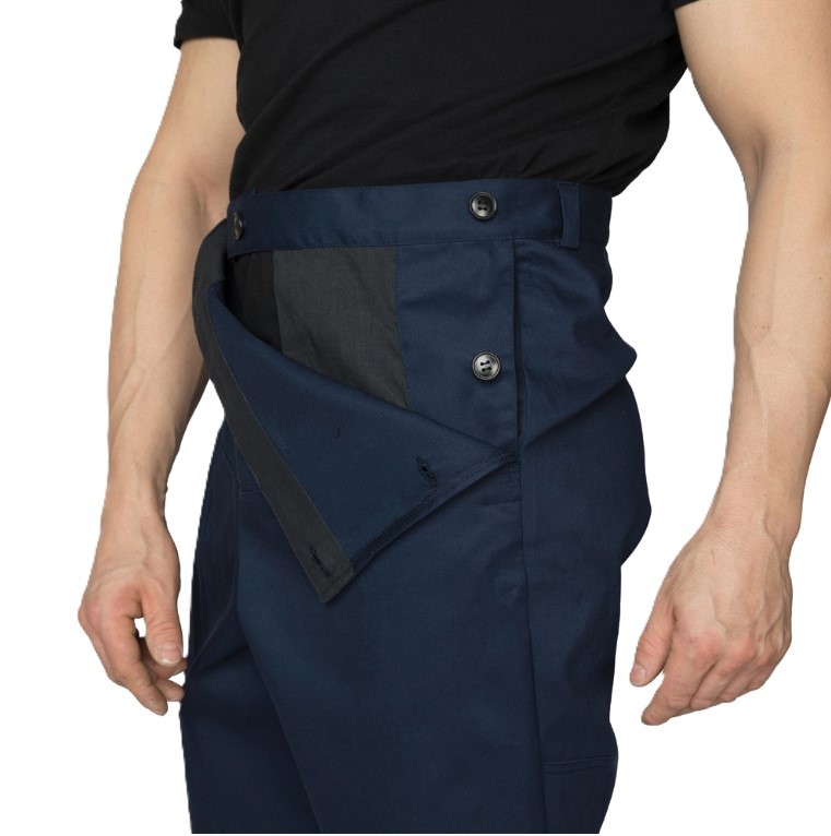 - Брюки: прямого силуэта, с застёжкой на петли и пуговицы в боковых швах, с шлёвками на поясе, с откидывающейся передней частью — лацбантом, карманами, расположенными в боковых швах. Задние половинки с притачным поясом, с вытачками по талии. Вверху шаговых швов расположены вентиляционные отверстия.