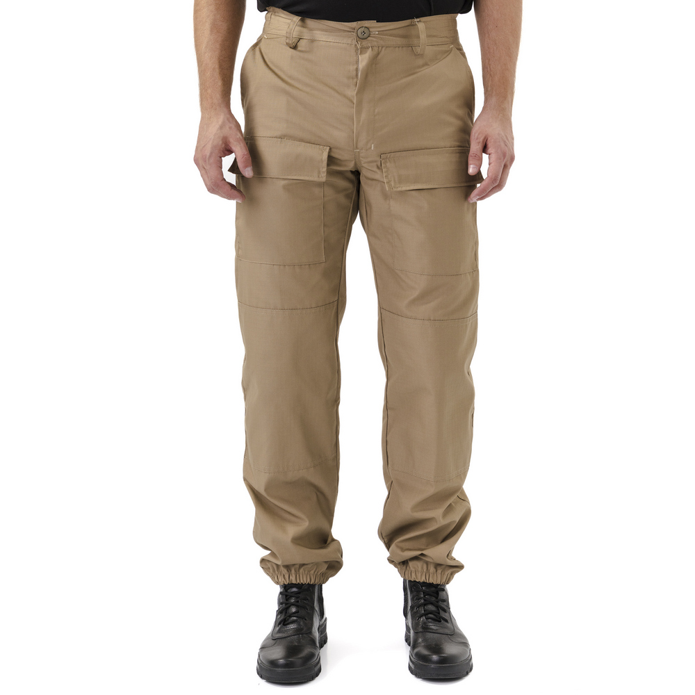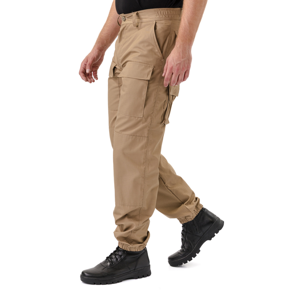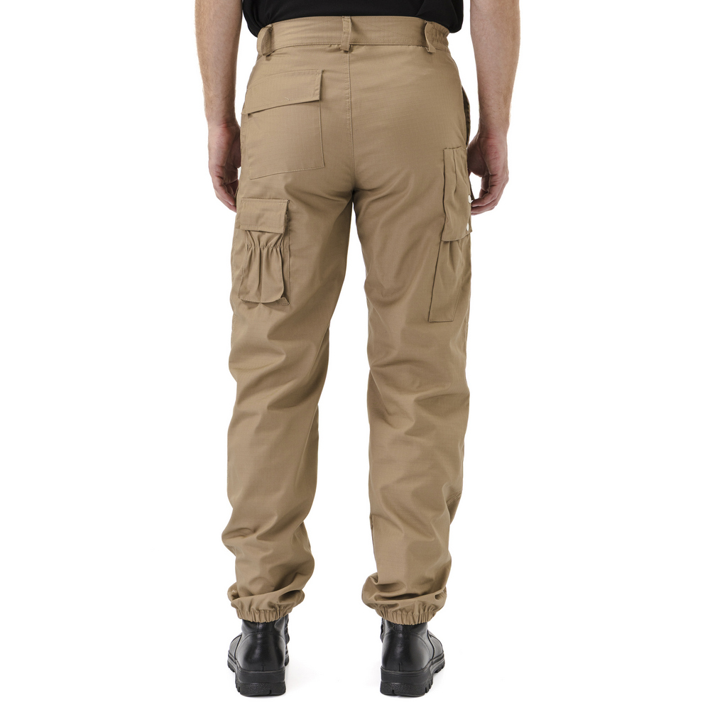 - Брюки прямые, свободного кроя, с широким поясом, стянутым боковыми резинками, со шлевками и пуговицей; застежка – гульфик на молнии; в верхней части два кармана с косым входом; выше линии колена накладные объемные карманы с клапаном на липучку; на задней половинке брюк с левой стороны два объемных накладных кармана с клапаном на липучку; на правой задней половинке брюк карман-патронташ с клапаном на кнопках; усилительные накладки в области колена; низ брюк на резинке; штрипки из перфорированной резинки крепятся с изнаночной стороны на пуговицы.