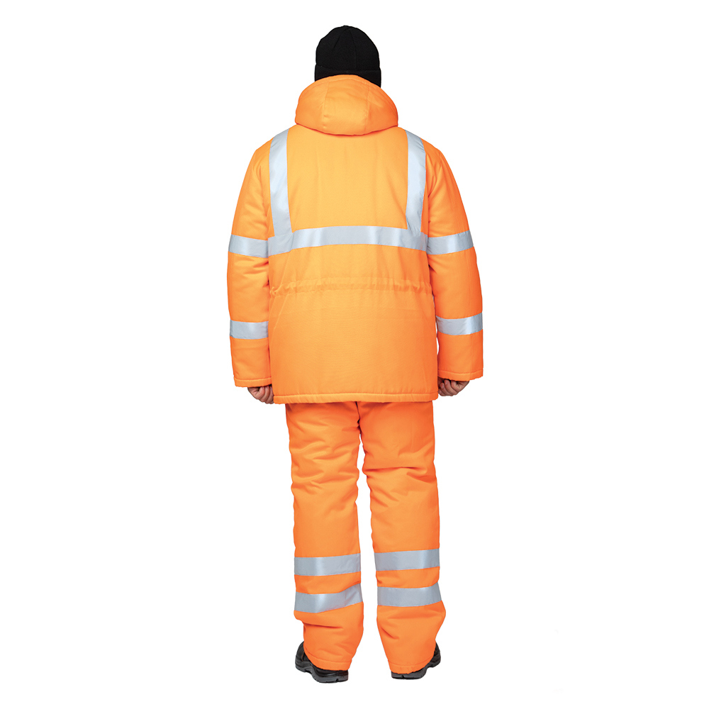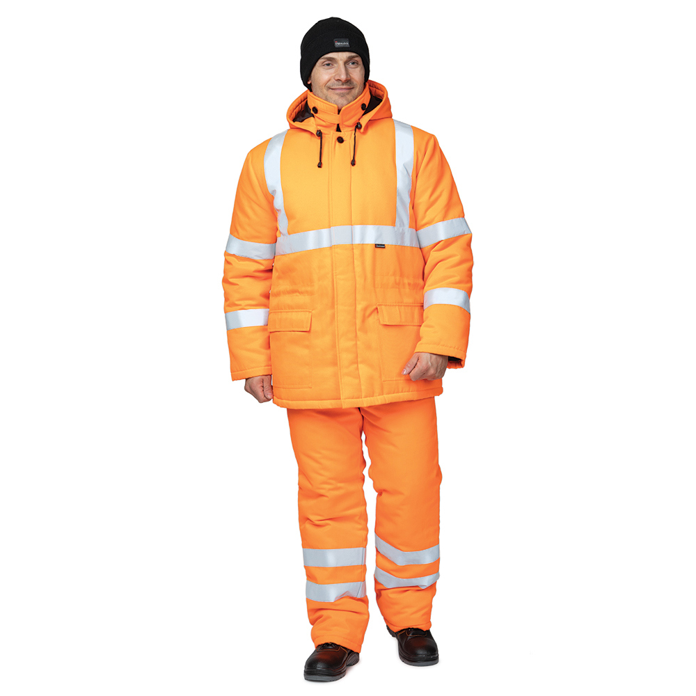 Костюм утеплённый «Дорожник 2» оранжевый сигнальный — это модель костюма от производителя ПРАБО в линейке недорогой сигнальной одежды повышенной видимости. Утеплённый костюм предназначен для работников дорожных служб и других отраслей при работе в зимнее время на открытом воздухе. Костюм соответствует ГОСТ по 3 классу сигнальной защиты, имеет 2 класс защиты от пониженных температур и гарантирует защиту до -18°С (предназначен для III климатического пояса). Шьется из смесовой ткани плотностью 190 г/м² с влагоотталкивающей пропиткой, обладает повышенной устойчивостью к влаге и атмосферным осадкам, и дополнительно обеспечивает защиту от общепроизводственных загрязнений. Костюм комплектуется утеплённой курткой со съёмным капюшоном и тёплым удобным полукомбинезоном.