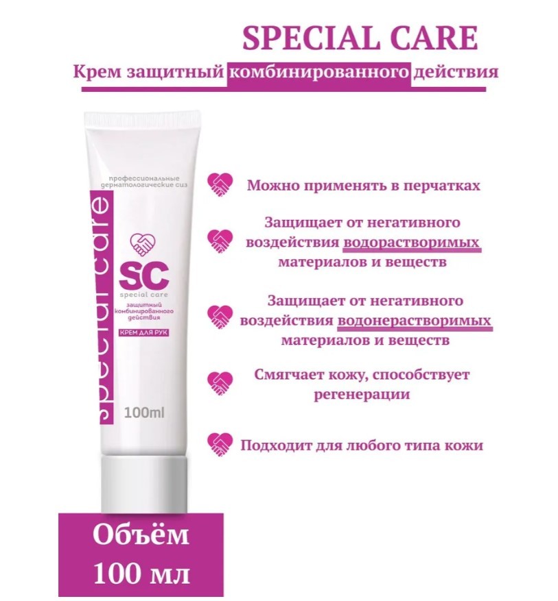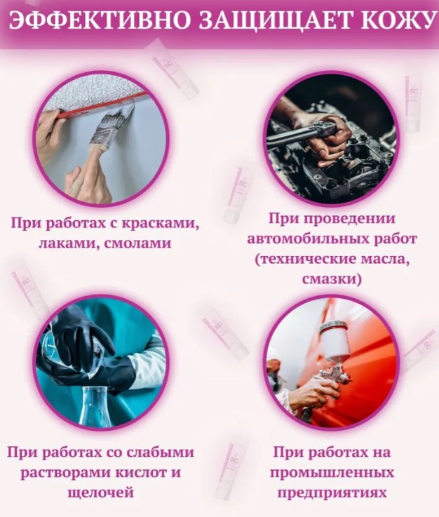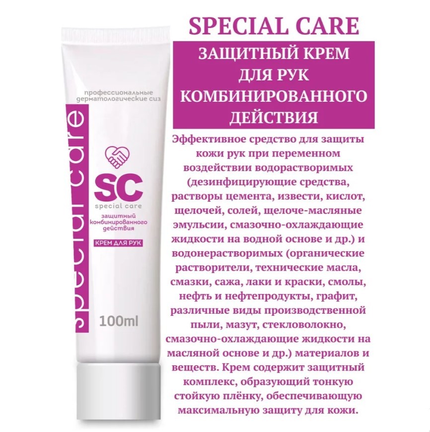 Крем защитный комбинированного действия — эффективное средство для защиты кожи рук при попеременном воздействии водорастворимых (дезинфицирующие средства, растворы цемента, извести, кислот, щелочей, солей, щёлоче- масляные эмульсии, смазочно-охлаждающие жидкости на водной основе и др.) и водонерастворимых (органические растворители, технические масла, смазки, сажа, лаки и краски, смолы, нефть и нефтепродукты, графит, различные виды производственной пыли, мазут, стекловолокно, смазочно-охлаждающие жидкости на масляной основе и др.) материалов и веществ. Крем содержит защитный комплекс, образующий тонкую стойкую пленку, обеспечивающую максимальную защиту для кожи.