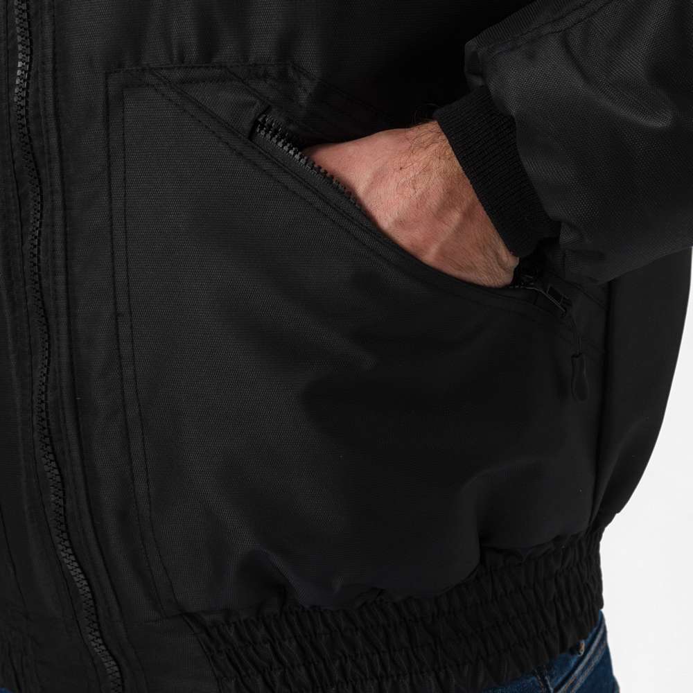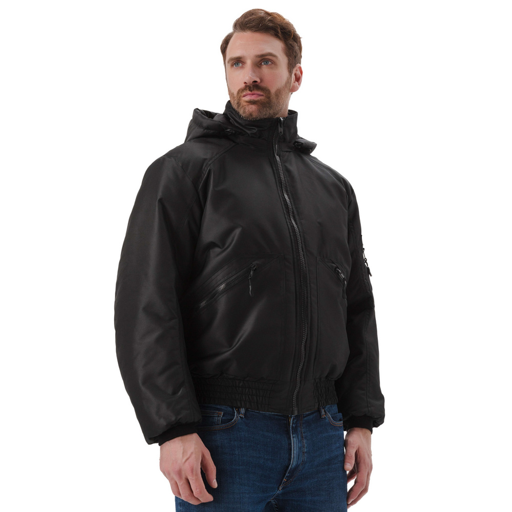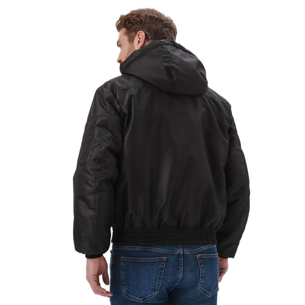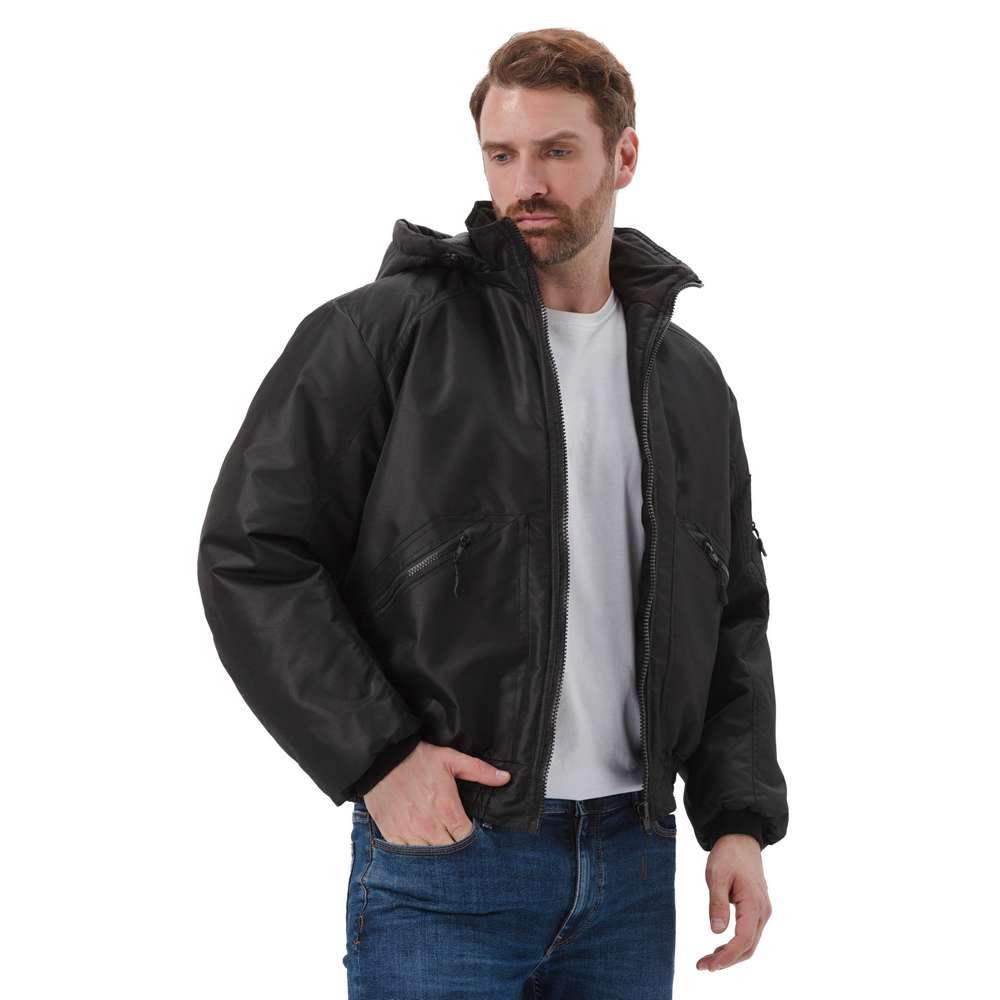 Куртка демисезонная «Бомбер» (черный) с отстёгивающимся капюшоном на молнии. Укороченная, на притачном поясе с резинкой, с центральной застежкой на разъемную молнию трактор Т5.
