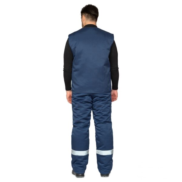 Жилет утеплённый прямого силуэта, с V-образной горловиной, с закруглением по низу борта, с центральной застёжкой на тесьму «молнию». Подкладка полочек и спинки простегана утеплителем с вертикальными строчками.
